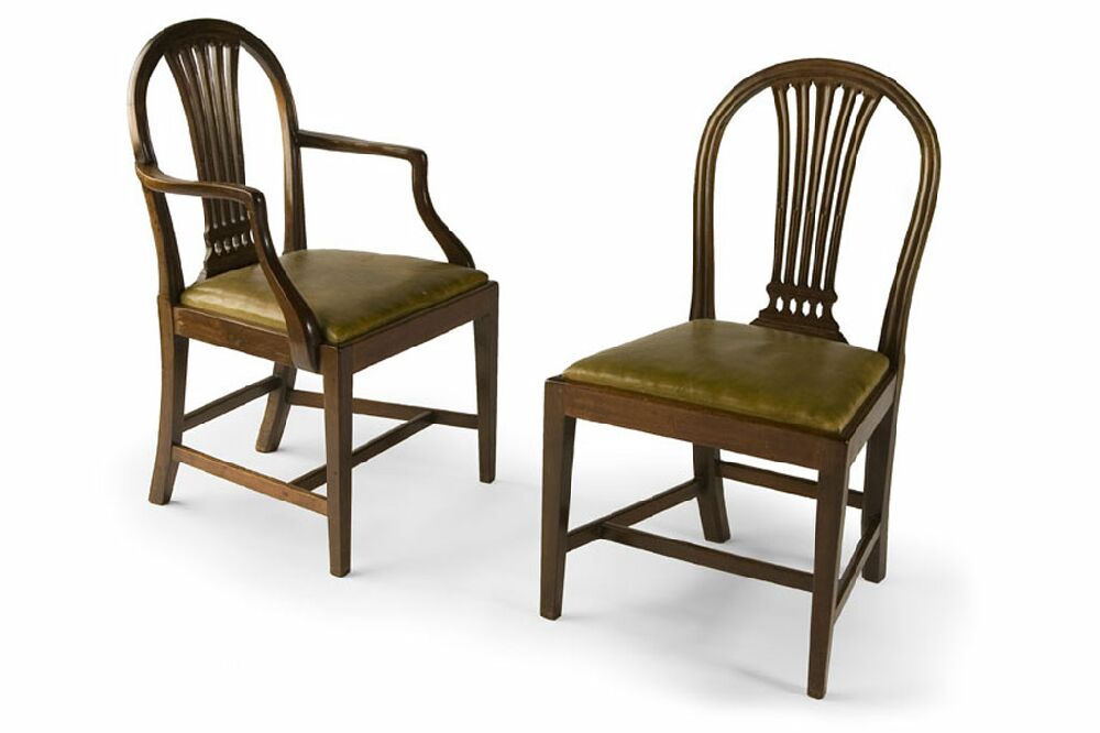 including a pair of armchairs, the moulded arched backs with stop fluted fan form backs above green leather covered drop in seats, on square tapered legs with H-stretchers, together with two further matching mahogany chairs (10)