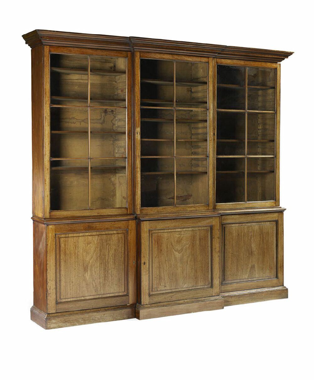the stepped moulded cornice above a central astragal glazed cupboard door enclosing shelves, flanked by a pair of conforming doors, the lower section with a central raised panel door flanked by two conforming doors enclosing shelves, on plinth bases