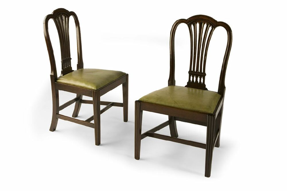 the cusped top rails with pierced and beaded fan splats above green drop in seats, on reeded square tapering legs united by H stretchers (2)