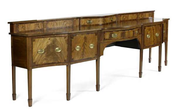 of large proportions, the stage back with central simulated drawer above an inswept top with reeded edge and arched frieze with single long drawer flanked by two cellarette drawers and two cupboard doors, divided by reeded uprights, on square tapering legs with spade feet, the whole decorated with flame veneers and boxwood lines, in restored condition