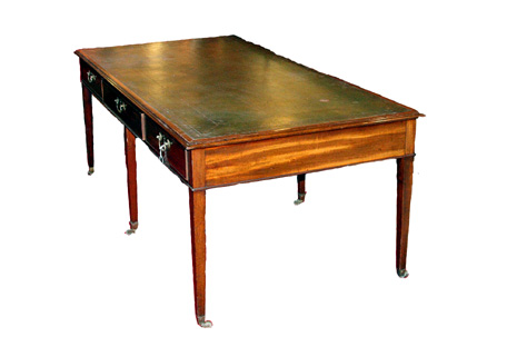 the gilt tooled green leather inset top with a moulded edge above three drawers and three opposing drawers, on six square tapered legs ending in brass caps and castors (central legs of a later date)
