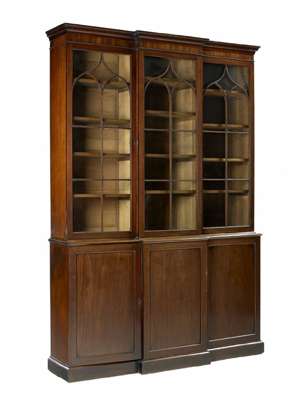 the moulded cornice above a central lancet astragal glazed door enclosing adjustable shelves flanked by a pair of conforming doors, below are three panel cupboard doors on plinth bases