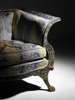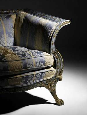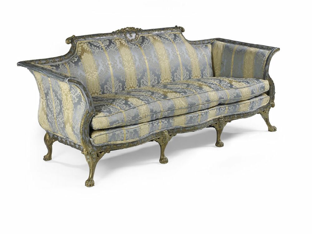 of serpentine outline, covered in cream and blue striped anthemion patterned fabric, the moulded frame decorated with trailing foliage, husks and flowerheads, the top rail centred by a flowerhead garland, the anthemion and scroll headed short legs ending in claw feet