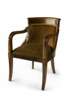 with gilt bronze mounts, the curved padded back with reeded downswept arms above a stuff-over seat covered in brown fabric, raised on sabre legs