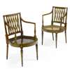 with painted bead, flowerhead, ribbon and guilloche decoration, the lattice panel backs above caned seats and open arms with vase-form supports, on slender turned tapered legs (2)