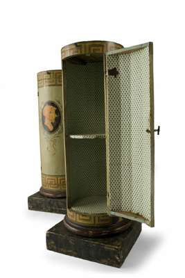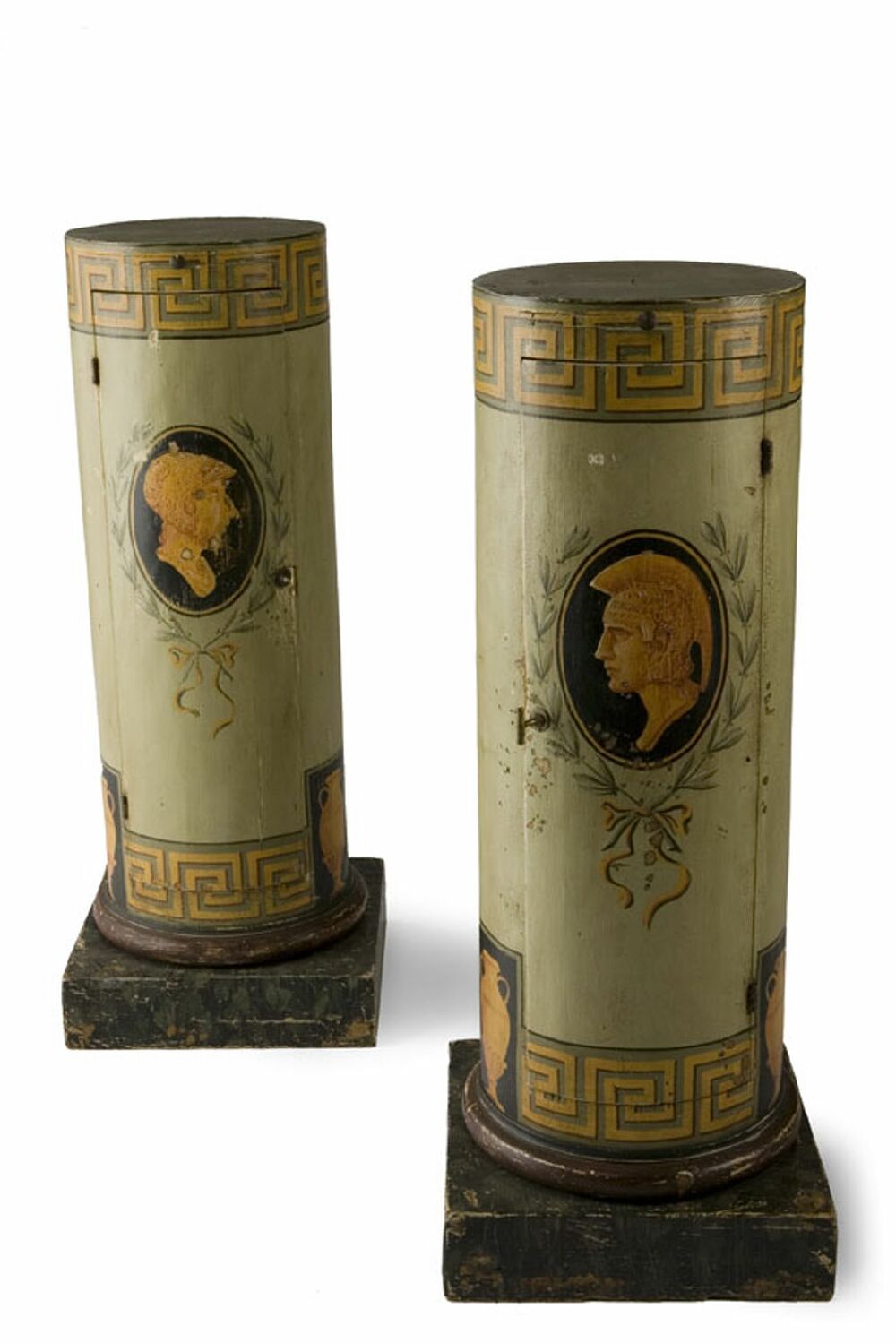 of cylindrical form the Greek key painted friezes with a brushing slide over a cupboard door centered profile portraits, opening to reveal a shelved interior and raised on faux marble square bases