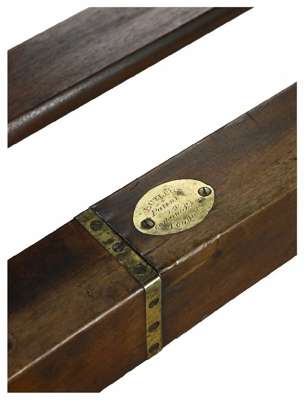 the fluted and reeded reduced front posts with later turned sections, with mahogany slat inserts and turned tapered legs with brass cappings and castors, bears oval brass insert inscribed, "Butlers patent 14 St....London" Provenance: Ex collection of Sir William Dunbar, the Boath House, Nairn