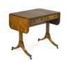 inlaid with mahogany and ebony stringing, the flame veneered top above two frieze and two opposing dummy frieze drawers, the uprights joined by a high stretcher, on sabre legs ending in brass cappings and castors