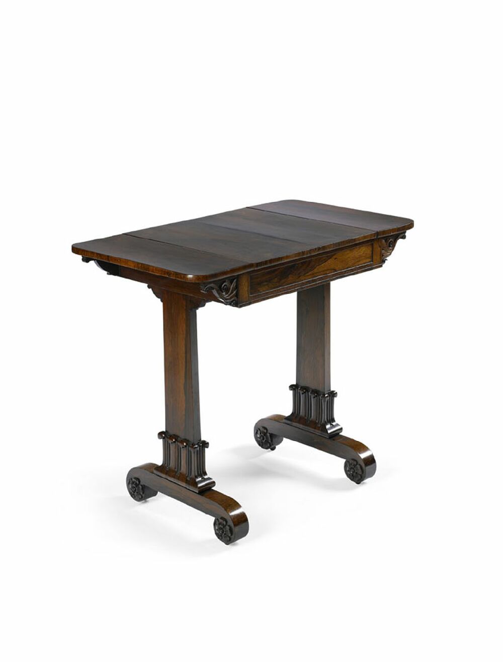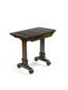 the rounded rectangular top with a sliding reversible central section with an inlaid chessboard to one side, below is an inlaid backgammon board, the panelled frieze with scroll carved corbels, the tapered end supports ending in leaf carved collars and scroll platform feet with foliate roundels and castors