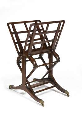 the central trestle stand with trellis framed wings on adjustable ratchet supports, on dual outsplayed tapering legs ending in brass paw caps and castors