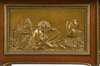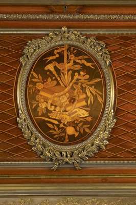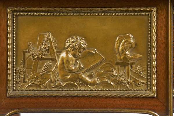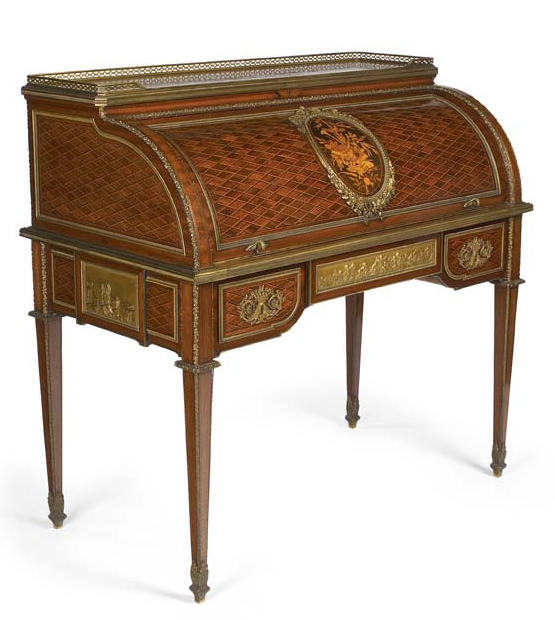 the rectangular top with pierced gilt metal gallery above a cylinder fall decorated with a ribbon-tied marquetry musical trophy, releasing a writing slide with tooled leather inset and enclosing four short drawers around a shelved centre, similarly embellished with satinwood crossbanding and parquetry, the shaped frieze with a central button release drawer, mounted with a plaquette depicting a procession of Bacchanalian cherubs, flanked by two short drawers with bold rococo cast escutcheons applied with finely chased flower-filled baskets flanked by acanthus scrolls, each side with further plaquettes cast with cherubs allegorising the Arts of Sculpture and Painting, the frieze drawer stamped 'EDWARDS & ROBERTS', and with an internal label: 'Edwards and Roberts, Wardour St., 126 Piccadilly, 532 Oxford St., London' , the whole framed by rope twist, foliate cast, corrugated and beaded mounts and decorated with line inlay, on square tapering legs ending in stiff leaf cast sabots