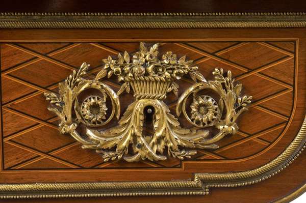 The firm of Edwards & Roberts was noted for the exacting standards it brought to a wide range of furniture. Notwithstanding the firm's own high standards, this desk could be regarded as being of 'exhibition quality', drawing its inspiration from the virtuoso work of 18th century French cabinet makers, and particularly, the designs of Jean-Henri Riesener.