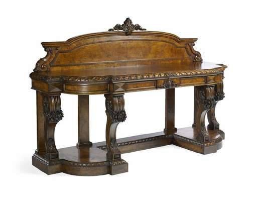 the arched panel back surmounted by a foliate carved cresting, the shaped top with gadrooned edge over one frieze drawer, raised on scroll supports carved in high relief with floral swags, ending in an inverted breakfront shaped platform base, drawers stamped Edwards & Roberts, Wardour Street, London