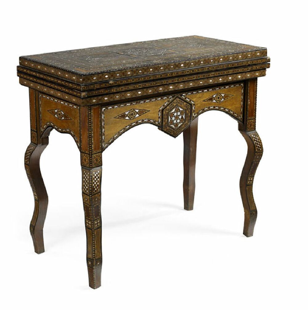profusely inlaid throughout with chequer banding, geometric motifs and mother of pearl decoration, the foldover swivel top revealing a central baize playing surface with a compartmental surround, the baize surface folding back to reveal a backgammon board with thirty-two counters, below are arched aprons, the whole raised on square cabriole legs