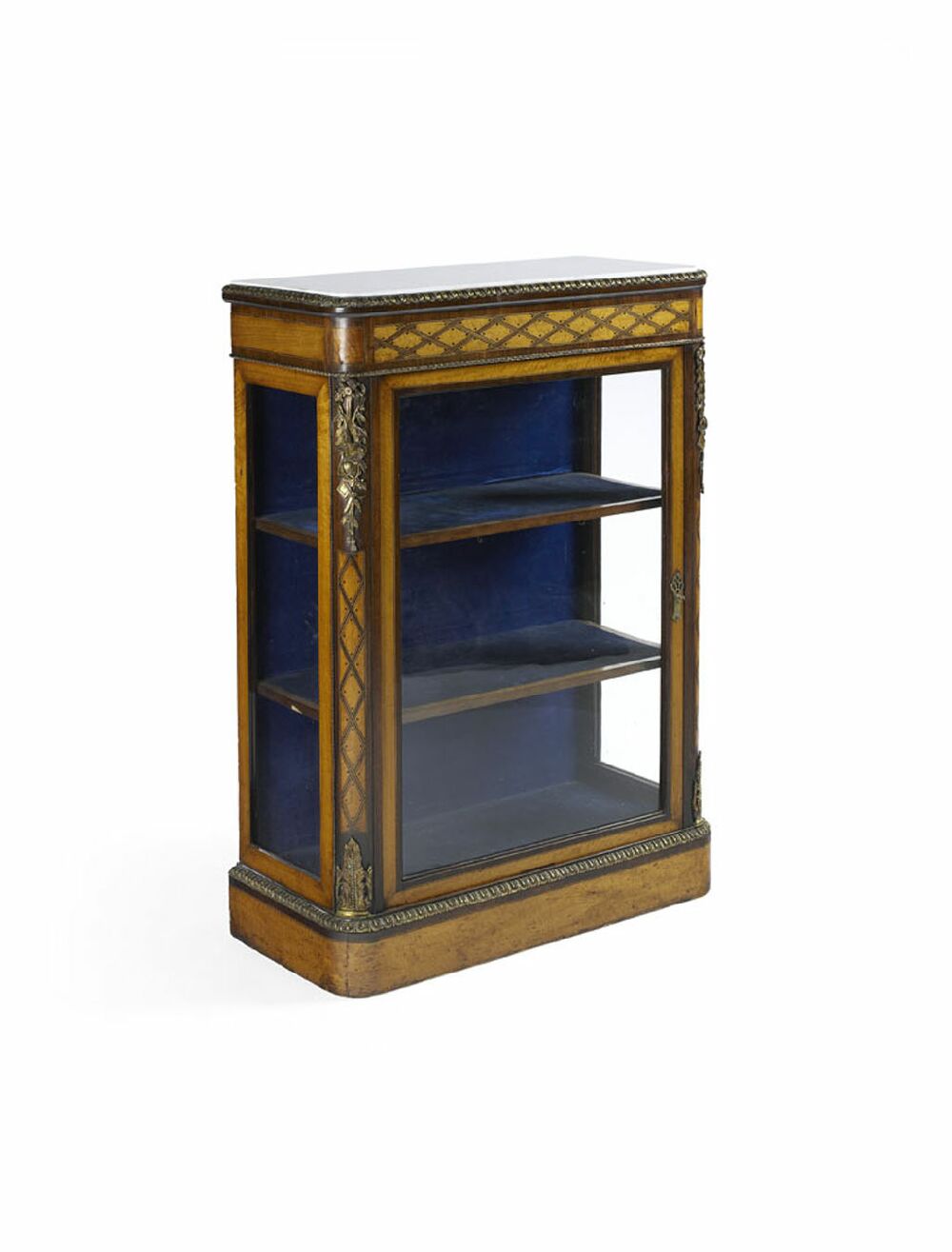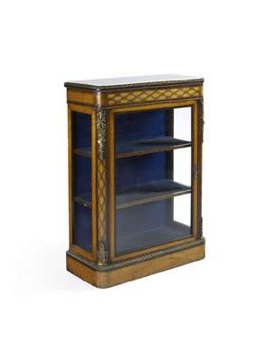 attributed to Donald Ross, with gilt brass mounts, the mottled white marble top within a leafy gadrooned edge above a dot and trellis parquetry frieze, the glazed panel door enclosing two velvet lined shelves, the rounded corners with ribbon tied trophy mounts and further trellis inlay, the sides glazed, on a rounded plinth base