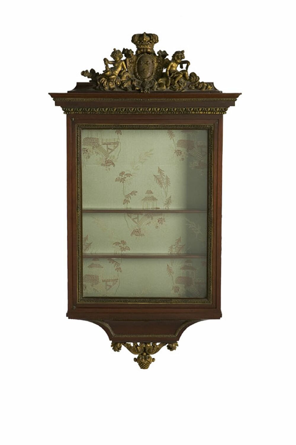 the surmount consisting of the Royal Arms of France with seated cherubs to either side, below is a stepped moulded cornice with lotus leaf and egg and dart gilt mouldings, the gilt moulded glazed door enclosing three glass display shelves, the waisted apron with a foliate scroll and pine cone gilt bronze mount, rear with inset hanging mounts