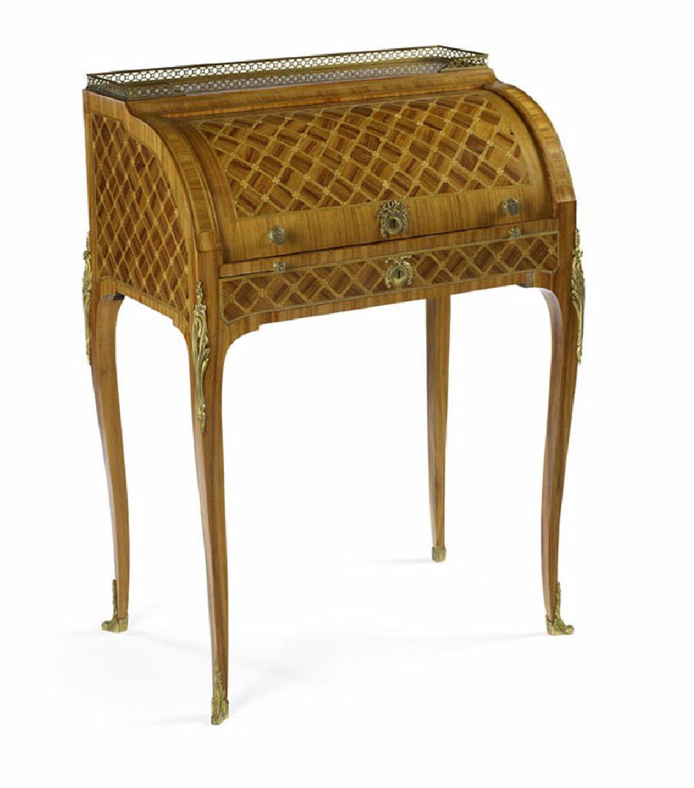 veneered throughout in a cube, clover and banded trellis pattern, the brass galleried top above a cylinder front opening to reveal a slide out leather inset and two drawers above a long frieze drawer, on slender cabriole legs with gilt metal mounts to the corner and feet