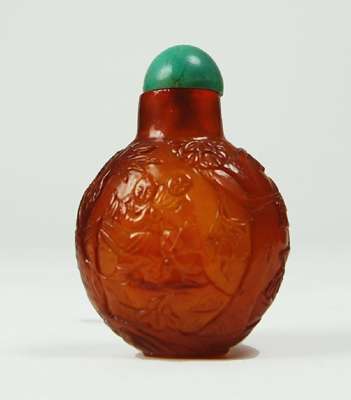 of oval baluster form, decorated with continuous carved figure panel by a fence and trees, with stand