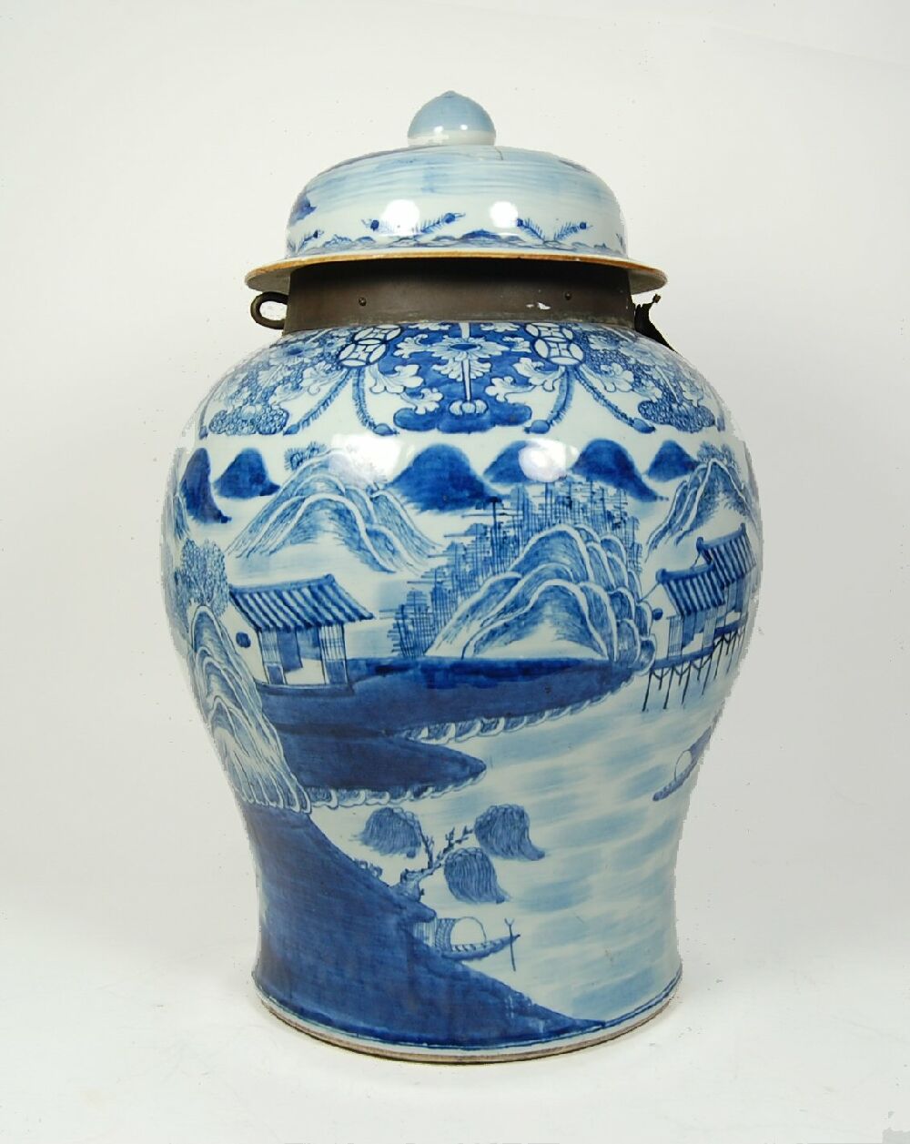 of baluster form, with metal locking mechanism to the neck, decorated with a continuous building and landscape scene