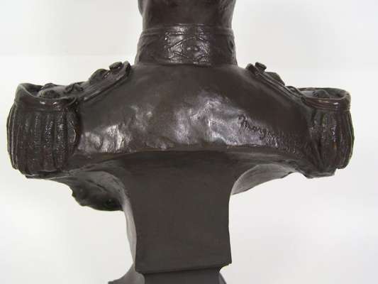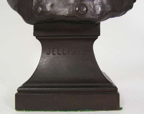 gazing forward in formal dress with fringed epaulettes and medals, on spreading rectangular plinth base inscribed 'JELLICOE' and signed verso in the bronze, 'Margaret Wrighton, 1910'