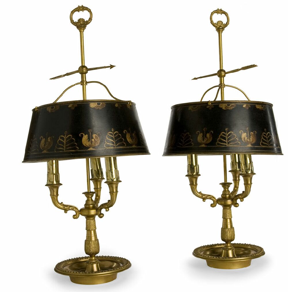 A pair of French 19th century gilt metal and tole peinte table lamps à buillotte