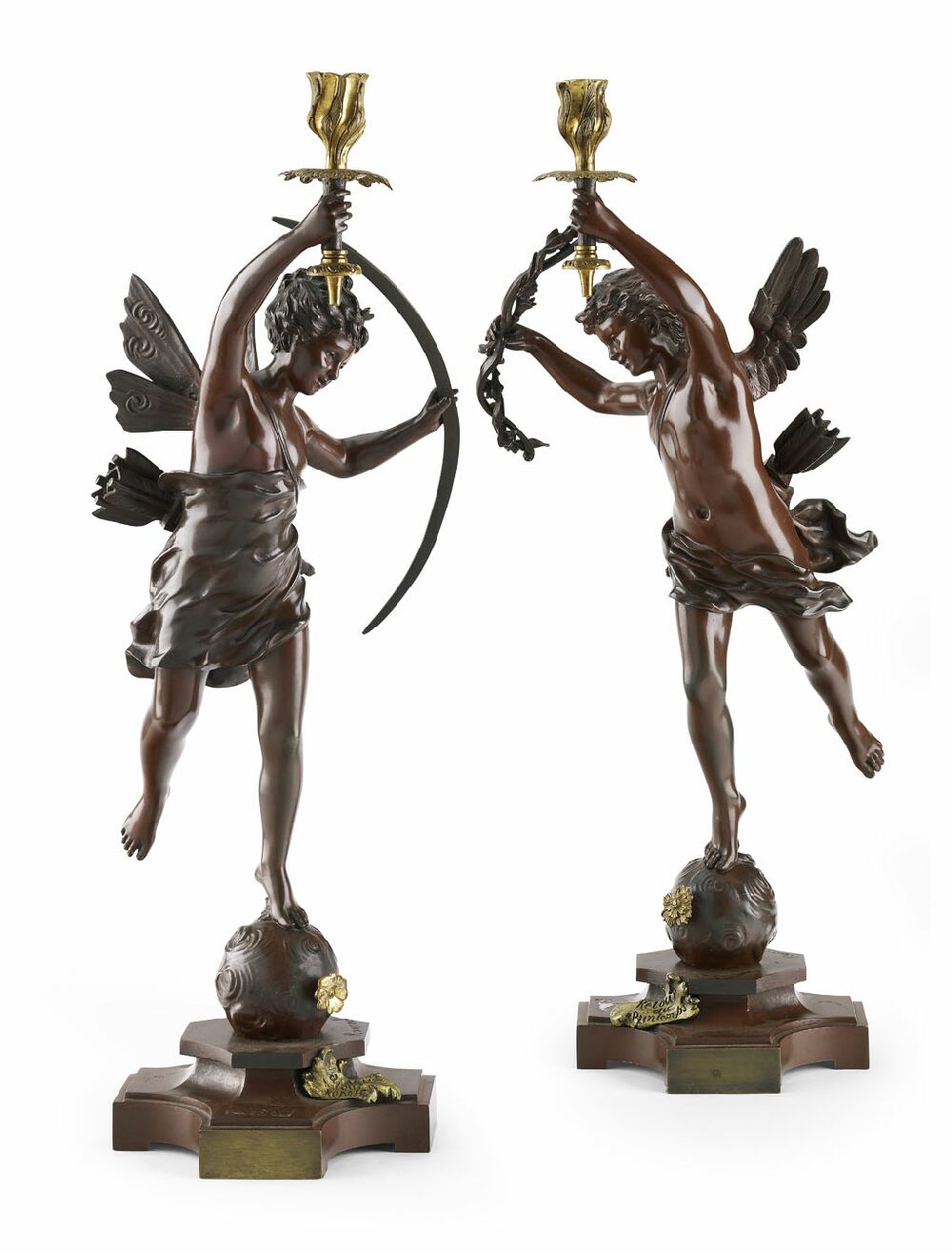 in the form of scantily clad figures of Cupid and Diana carrying their bows, each holding aloft a single rococo cast gilt metal nozzle, the figures standing on sphere surbases and stepped quatreform plinths, applied with title cartouches: 'Retour du Printemps' and 'A Nuit Tout Repose' , copper patination, signed in the bases (2)