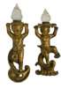 in the form of cherubs holding aloft fronds, each with one leg raised above a C and S rococo scroll carved plinth, with flame glass shades (2)