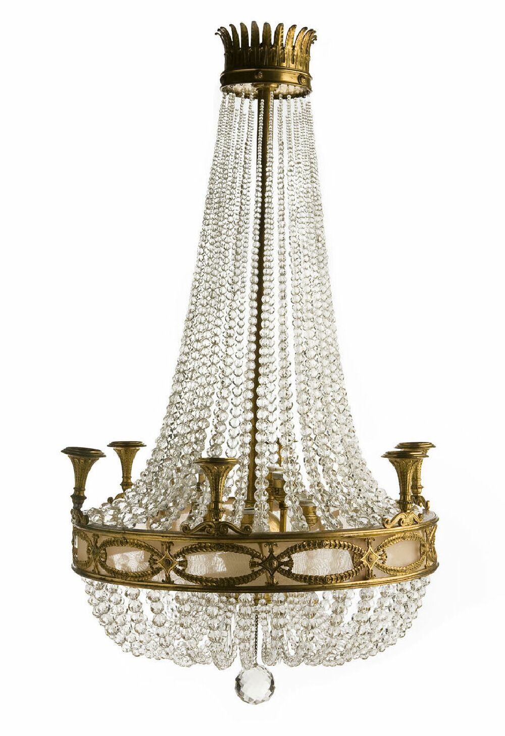 the stiff leaf cresting ring hung with a cascade of graduated cystalline glass beads to a wreath cast frieze mounted with six further leaf cast trumpet-shaped sconces, the lower strings of drops upswept to a central boss