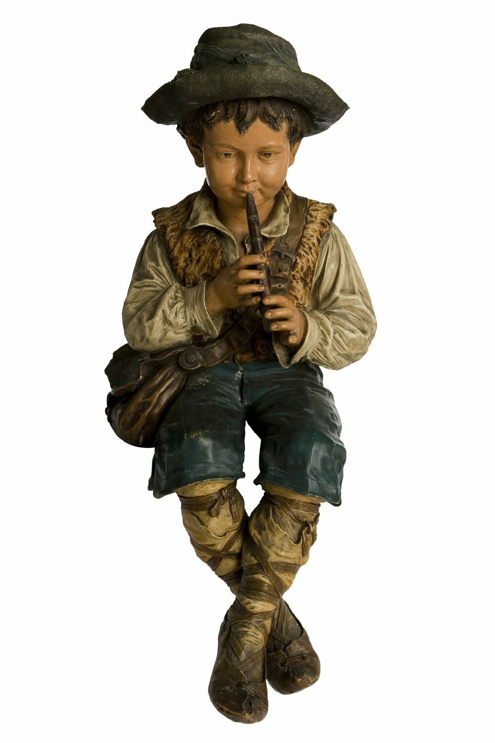 designed to be seated as a table-top figure, the boy wearing a rustic brimmed hat and smiling whimsically as he plays, clad in an open shirt and jerkin with blue breeches and laced sandals, a satchel slung over his shoulder