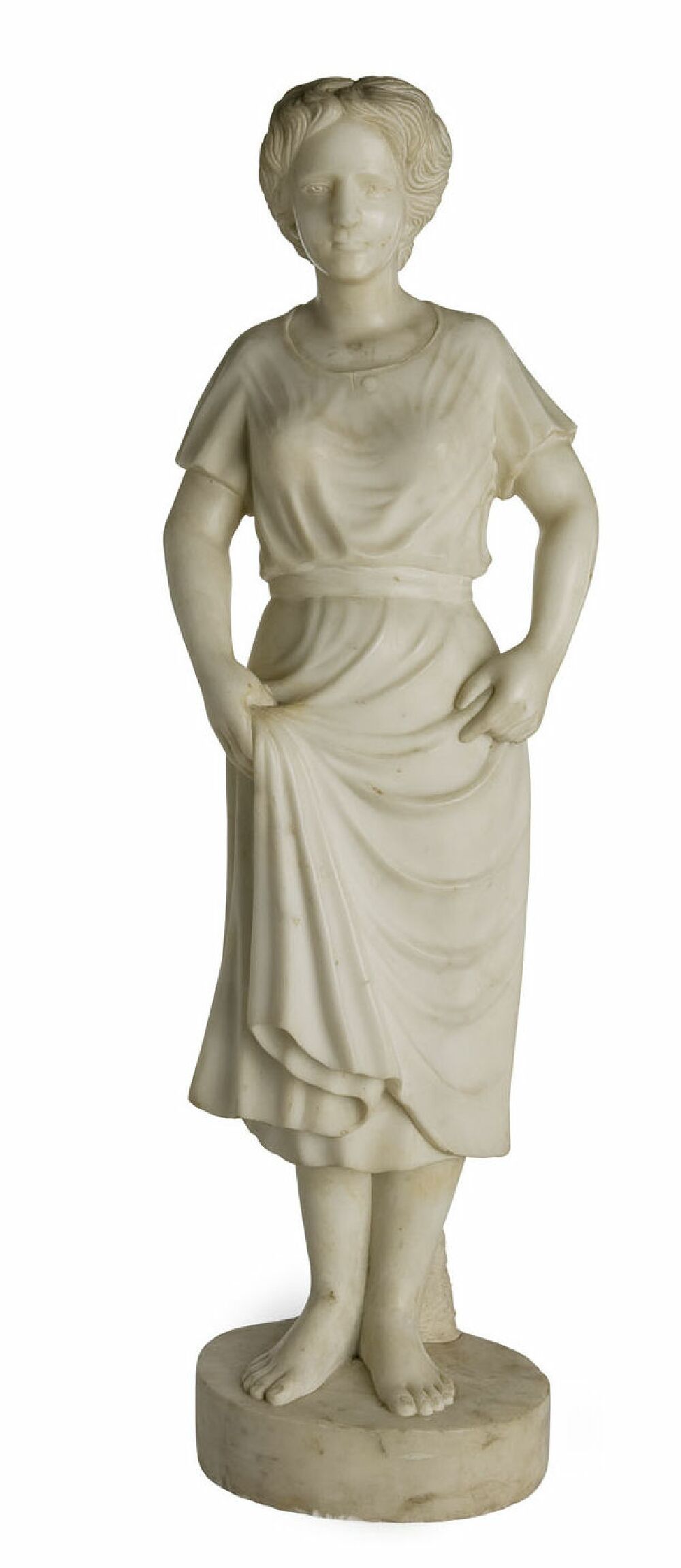 gazing forward, her hands clasping the folds of her dress, on a circular plinth base, inscribed 'Lucianno' , carrara marble