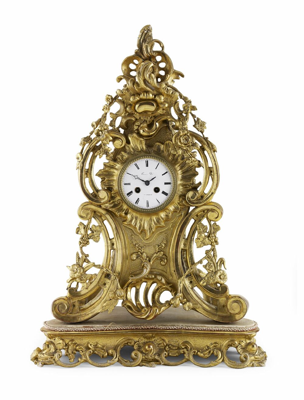 the rococo carved and pierced case draped with festoons enclosing a enamelled Roman dial with maker's signature, on scrolling feet, the metal case enclosing an eight day movement with silk suspension and single bell strike stamped 'Bolviller a Paris', on a rococo carved and pierced gilt wood stand of serpentine outline