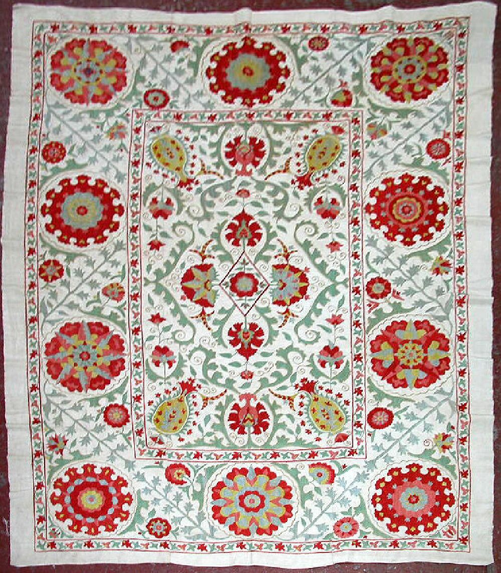 modern, the cream field with rosette in lozenge flanked by palmettes, within wide rosette and diagonal vine border between bands