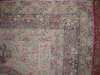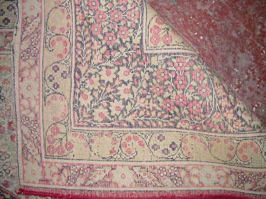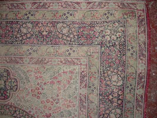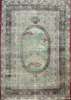 late 19th/early 20th century, the cream floral field with central pictoral oval depicting two cows in a landscape with building behind, flanked by indigo quatrefoil pendants, within indigo floral vine border between camel and rose bands (worn)