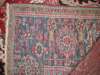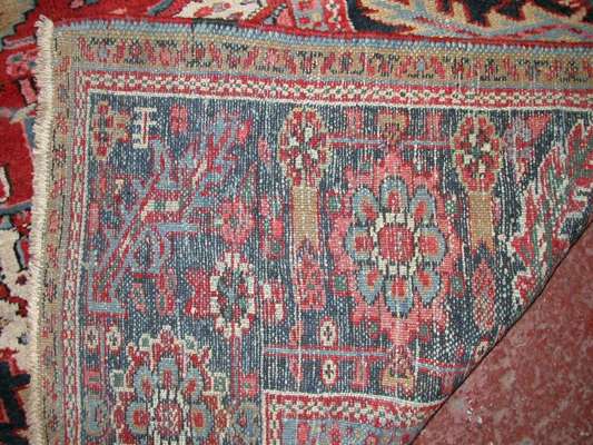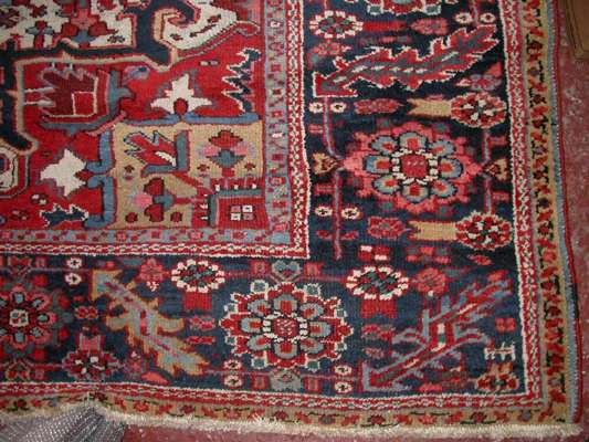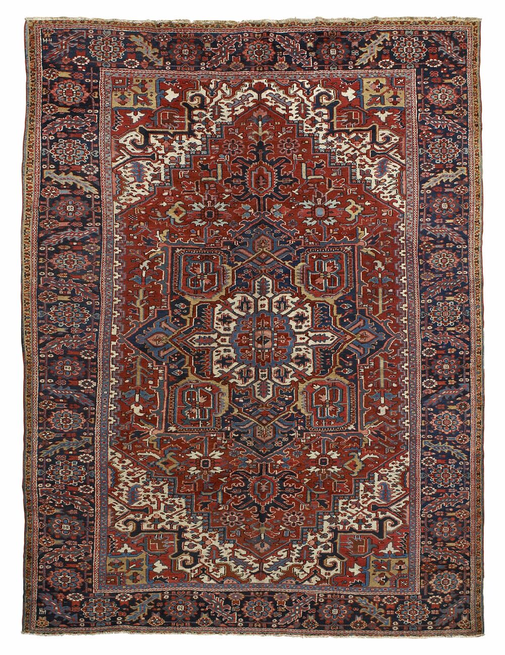 early 20th century, the red field with central indigo and ivory medallion suspending pendants, ivory, red and ochre spandrels, within indigo rosette and serrated leafy vine border between blue and ochre bands