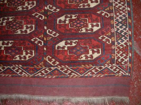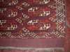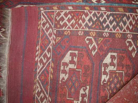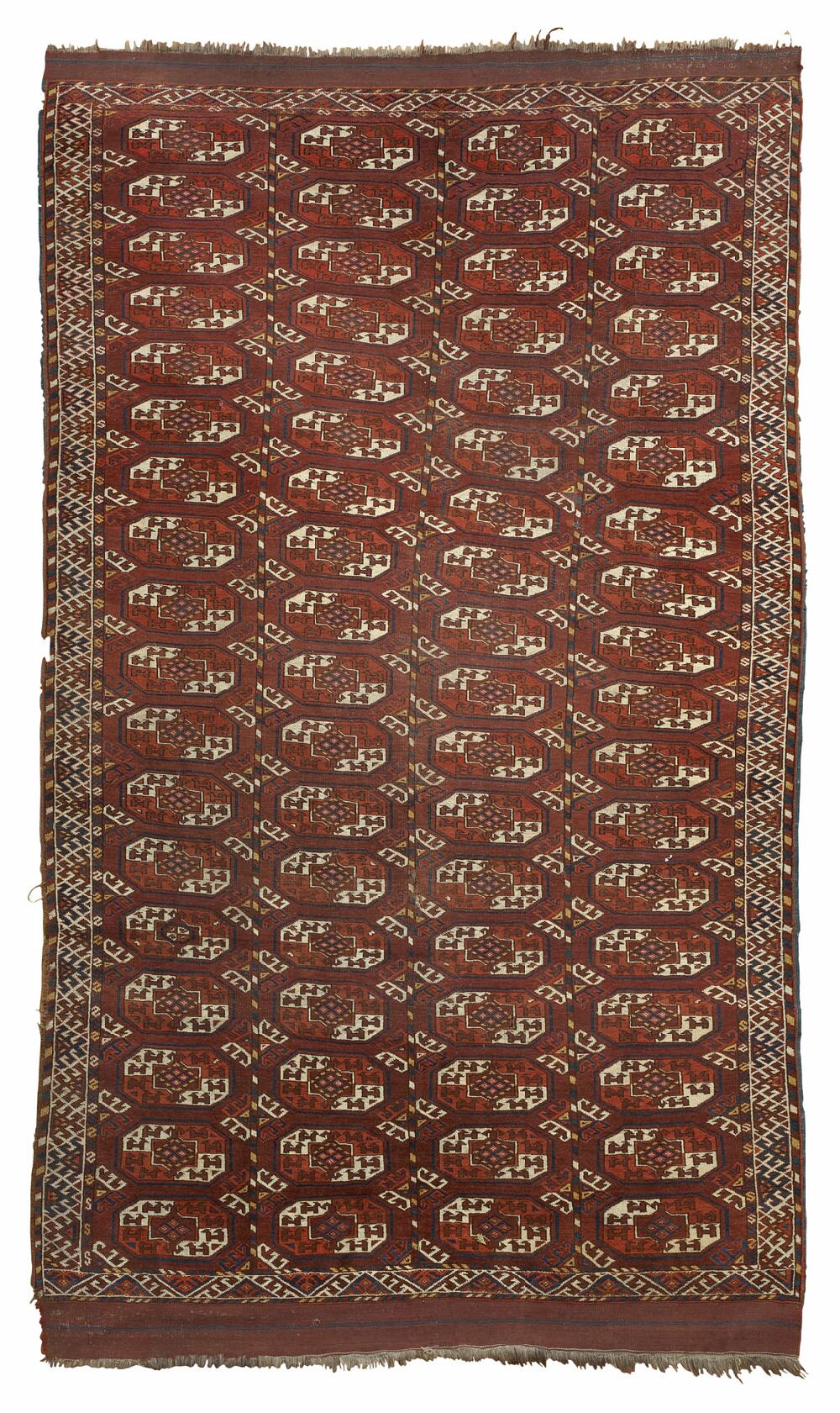 late 19th/early 20th century, the rust red field with four columns of eighteen guls between striped poles with hooked lozenge motifs, within ivory hooked pyramid border between S and striped bands