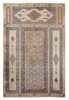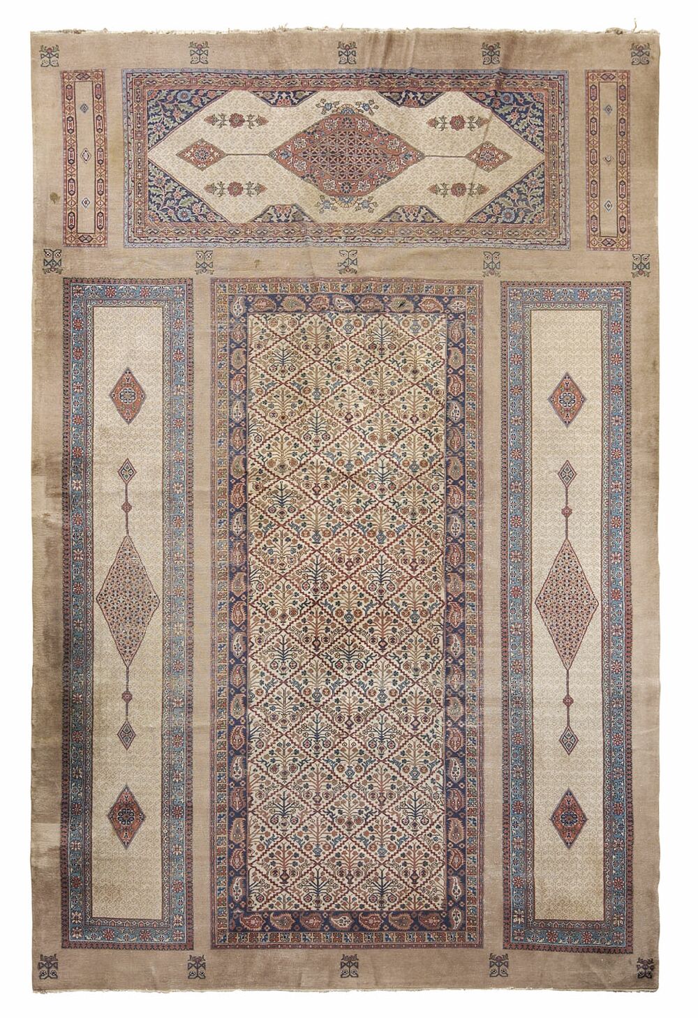 early 20th century, of Serab style, woven in set pattern, with main carpet flanked by runners and a kelleh, the main cream field with allover foliate lattice, within indigo border, the others with patterned camel fields with indigo lozenge medallions suspending pendants