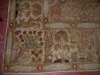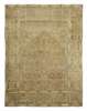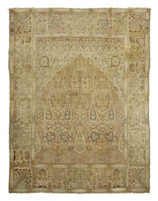 late 19th century, the faded rust mihrab field with cypress tree and foliate pattern, cream spandrels and castellated bar, within cream tree and floral vase border between lemon cartouche bands (faded)