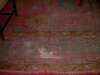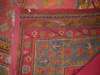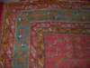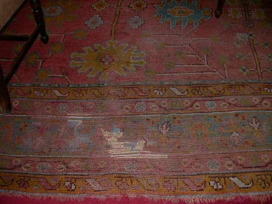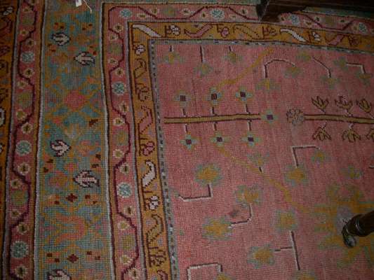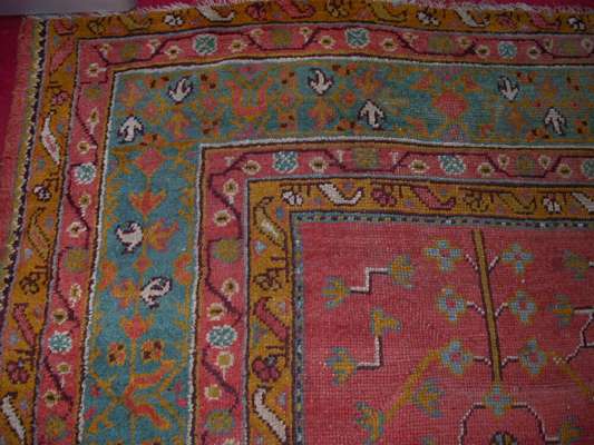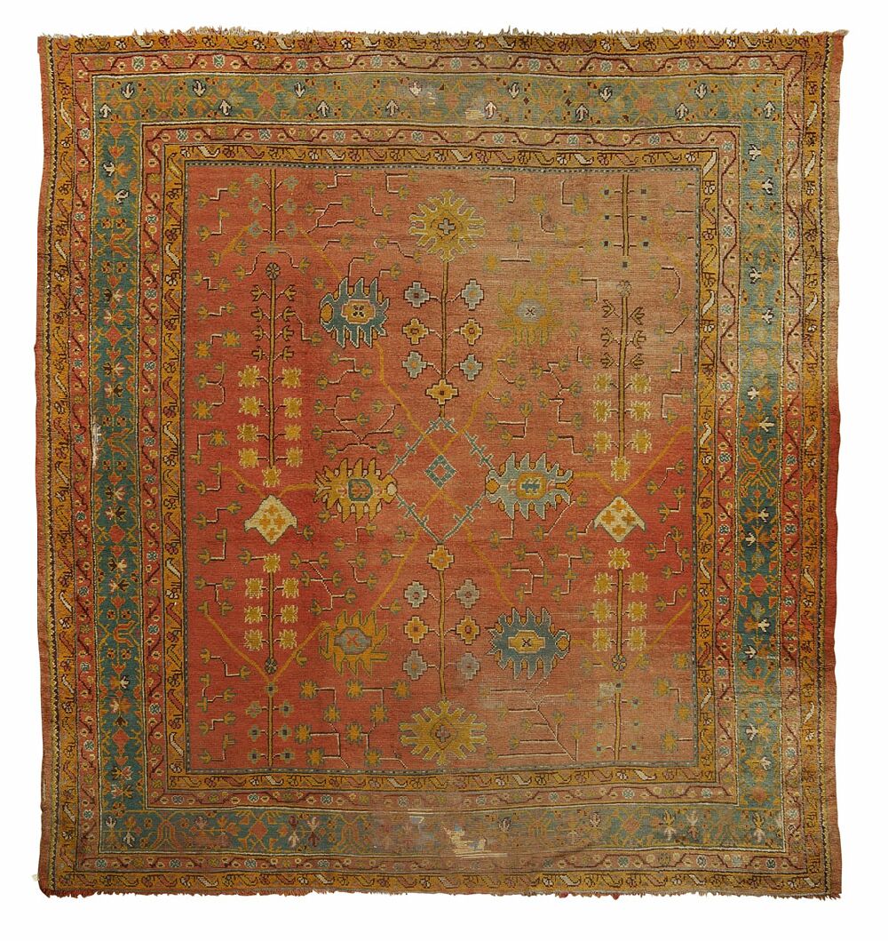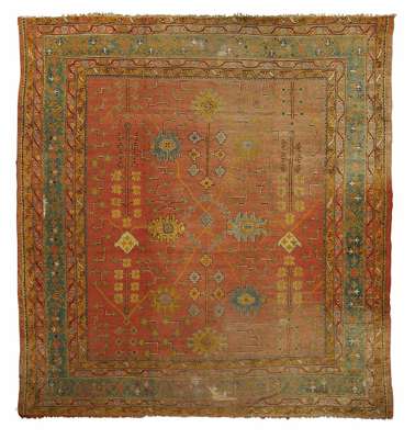 late 19th century, the faded red field with serrated palmette and foliate vine pattern, within turquoise stylised vine border between red and ochre bands