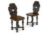 the cartouche shaped backs with swan neck crestings above figures draped in robes gesturing towards the boldly carved fruiting vines above, the solid seats with inswept corners, on inverted baluster turned legs united by flattened serpentine X-stretchers with boss finials, on spreading bun feet (2)