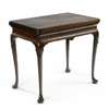 the rectangular swivel top with moulded edge enclosing a baize inset and recessed compartment above a cavetto frieze with central pendant, on lappet carved cabriole legs ending in pad feet