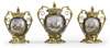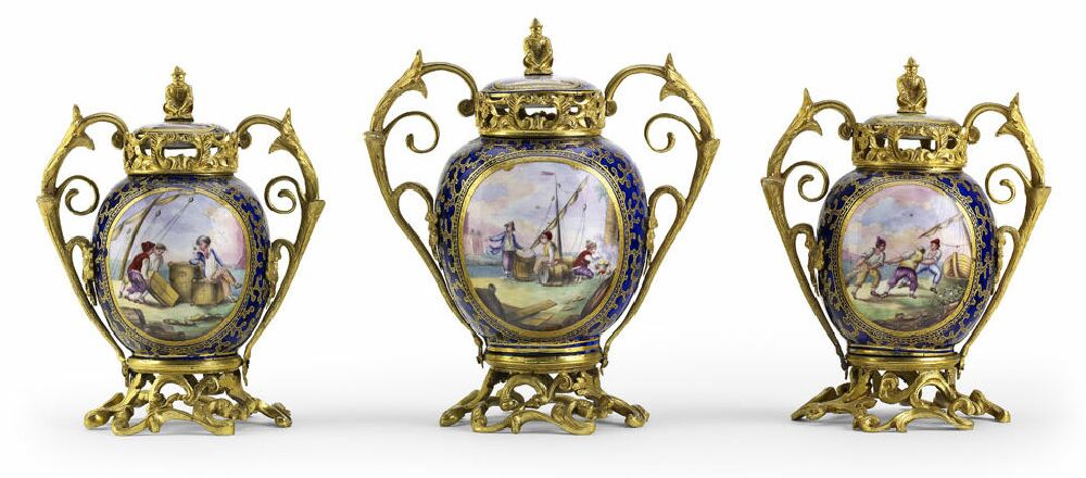 each of ovoid form, with giltmetal figural finial, foliate rococo scroll handles and feet, the cover painted with opposed oval landscape panels, the body with opposed oval painted panels painted with of figures in a harbour landscape, reserved on a blue and gilt scroll ground (3)