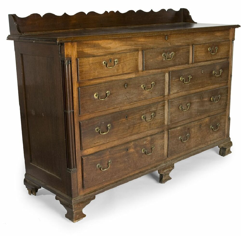 the low serpentine scroll-cut ledge back with plate rail above a hinged top with moulded edge revealing a shallow voided interior, the three lipped frieze drawers above a further bank of six lipped and graduated drawers with brass drop handles, between cluster column uprights, on ogee bracket feet