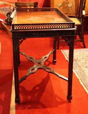 the rectangular top with open fretwork gallery, above blind fretwork frieze, on channelled chamfered legs with pierced spandrels and block feet, joined by shaped pierced X-stretcher, on brass castors