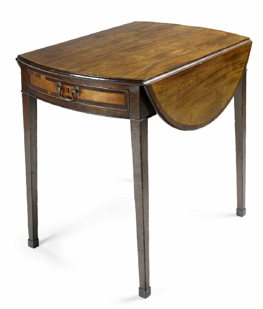 the oval top with chequer stringing and a moulded edge, the satinwood and banded bowfront drawer with an opposing dummy drawer, raised on square tapered legs