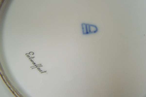 each with a gilt scroll decorated border with three cherub painted panels, the well with a painted panel of a lady with a cherub, entitled 'Entwaffnet' and 'Im Mai', signed, underglaze blue beehive mark and impressed mark (2)