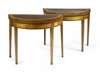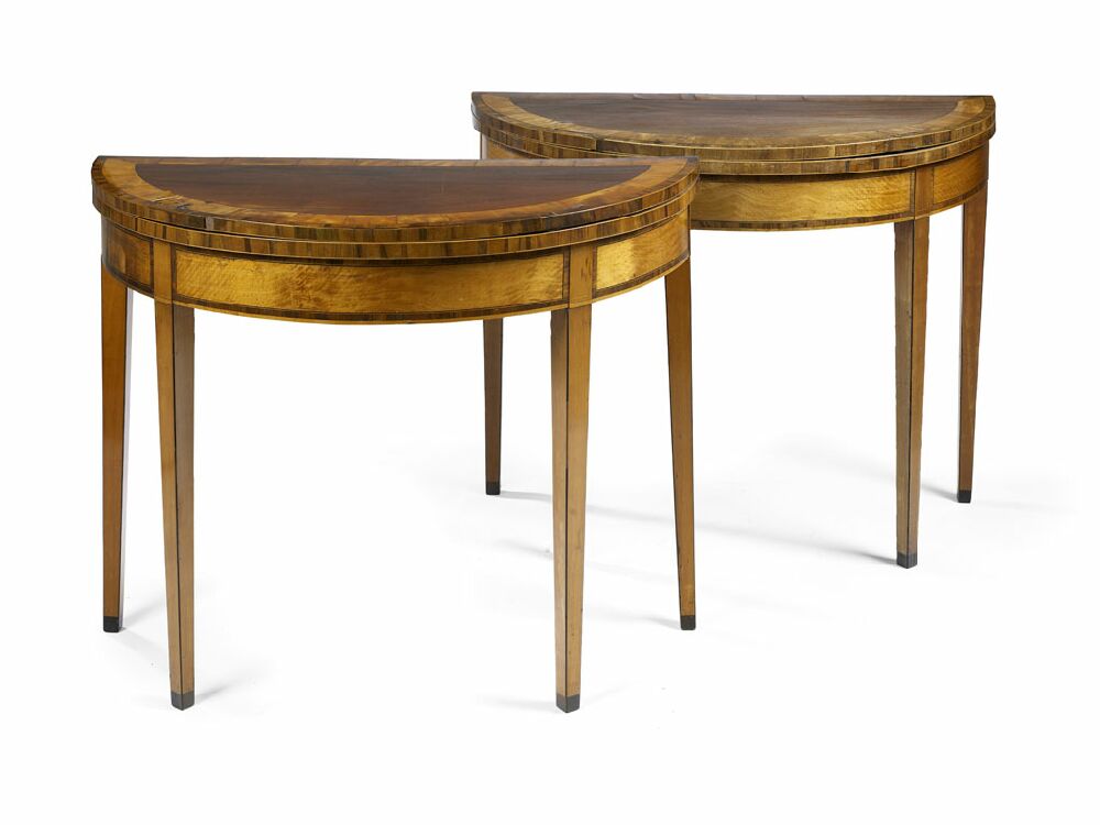 A pair of early 19th century mahogany and satinwood crossbanded demi-lune foldover games tables