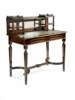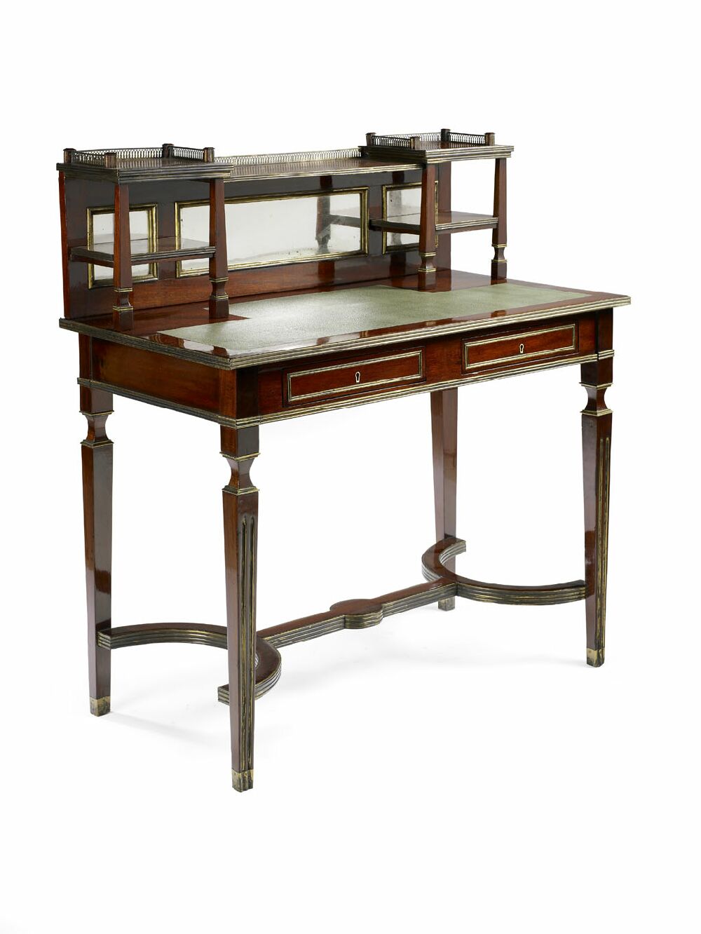 the shelved ledge back with gilt metal gallery and mirrored panels above a top with inset skiver and a pair of frieze drawers, on square tapering legs with brass flutes, united by double Y cross stretchers