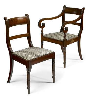 including a pair of armchairs with downswept scroll arms, with patterned fabric drop-in seats and inlaid with ebonised stringing, the reeded frames with curved top rails and mid bars, raised on simulated bamboo turned legs (8)