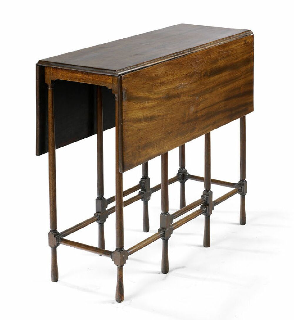 the solid drop leaves on eight slender turned legs, with gate action, ending in turned feet and united by stretchers