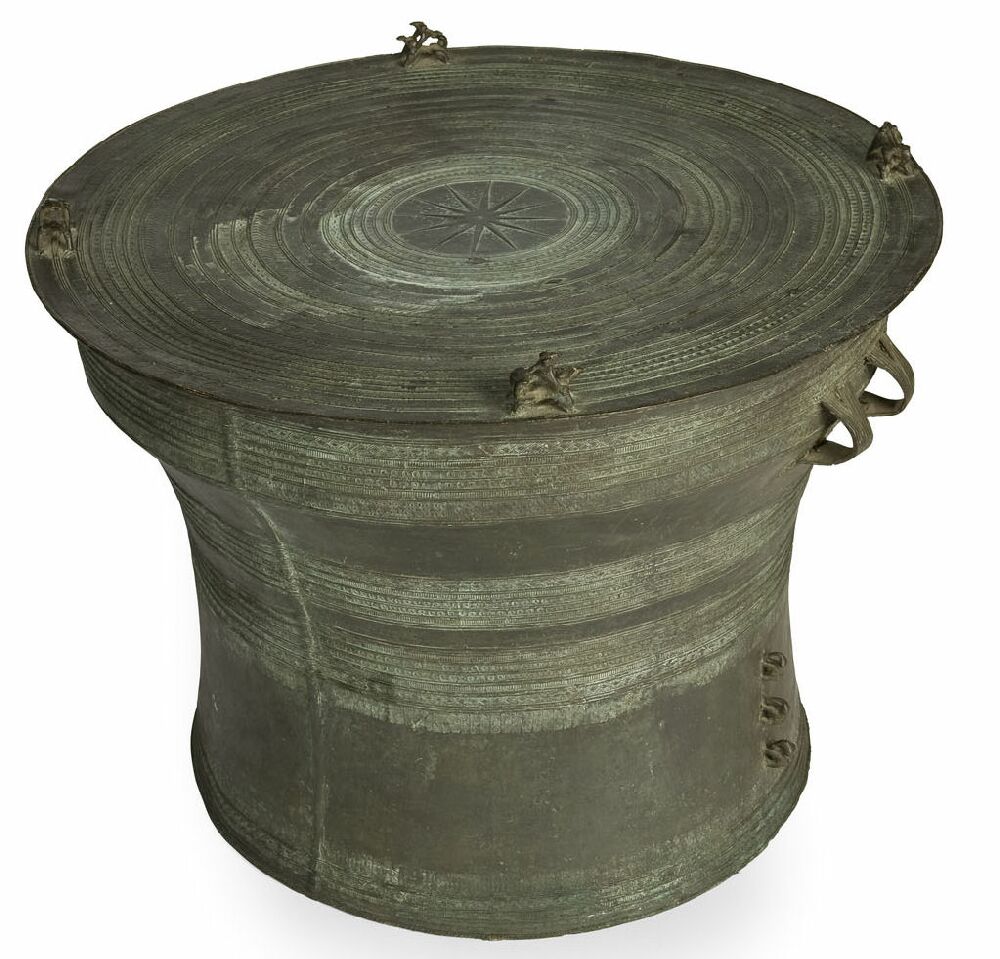 These drums, commonly known as Kha drums in Laos, are related to the idea of fertility are always decorated wih bronze frogs, which are symbols of water and rain, around the top. One-frog drums are the most ancient, dating from about 700 years ago, with three-frog drums being the most recent, dating from about 200 years later. Two-frog varieties, such as this drum, fall in the period in between and are the rarest of the three varieties.